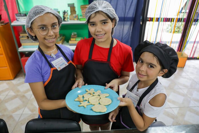 Pães de queijo saindo do forno, um bolo de chocolate quentinho, milk shakes e biscoitinhos com glitter em diversos formatos – esses foram alguns dos destaques que marcaram a segunda edição da colônia de férias Sabores e Histórias, que utiliza atividades lúdicas para despertar o amor pela literatura nas crianças de Taguatinga. A programação, elaborada em parceria com a Secretaria de Educação (SEEDF), começou na quarta-feira (5) e terminou nesta sexta-feira (7), na Biblioteca Escolar Comunitária Valéria Jardim.