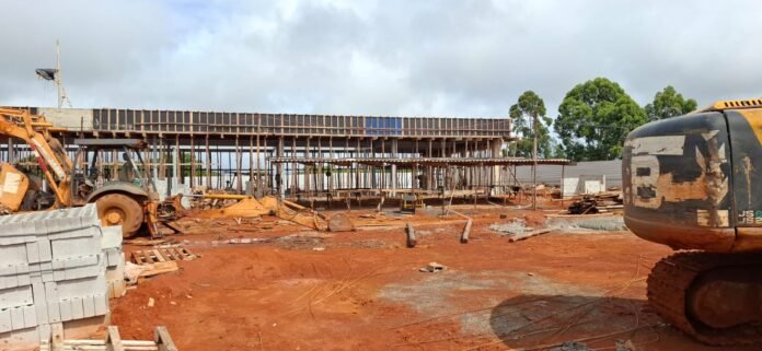 Também foram feitos os serviços de pintura da estrutura metálica, lajes, execução de reservatório superior e inferior e reservatório de amortecimento. Os próximos passos são a construção das paredes, colocação das esquadrias, instalação da cobertura de telha metálica e o fechamento lateral.