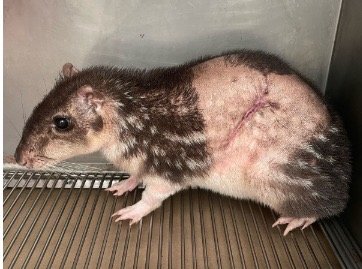 Resgatada em 23 de janeiro, em Ceilândia, o animal sofreu um violento ataque de um cachorro que lhe provocou uma grave laceração. Após o incidente, a paca foi submetida a uma cirurgia complexa para assepsia, reposicionamento da pele e sutura da ferida, procedimentos essenciais para conter o risco de infecções e garantir sua recuperação.