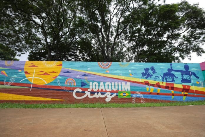 “Caminhando pelo mural você chega na corrida como campeão. Então é um pouco dessa história, de começar pequeno e lá no fim ser grande”, diz o artista plástico Toys Daniel, que pintou o moral em homenagem ao corredor Joaquim Cruz