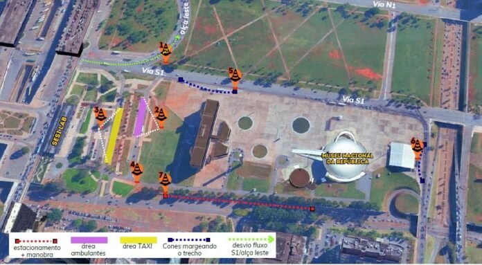 Nas vias entre o Museu Nacional e o Sesi Lab serão sinalizadas áreas para vendedores ambulantes e estacionamento para táxi. Os agentes também sinalizarão dos pontos de embarque e desembarque de passageiros próximos ao Museu. Na via S2, será delimitado um espaço para estacionamento e manobra. Durante o evento, o fluxo da via S1 será desviado para a alça leste da Rodoviária. A operação de desvio será realizada pela Polícia Militar, conforme a programação: nos dias 20 e 21/11, a partir das 18h, e no dia 22/11, a partir das 17h.